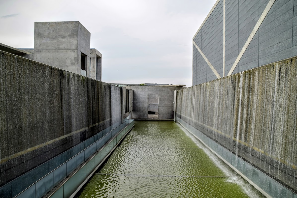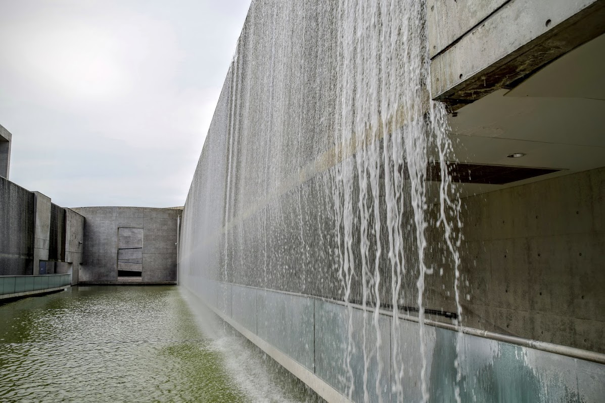 ある時間になると水が流れ水のカーテンの滝が流れる。奥に見えるのが博物館の入り口